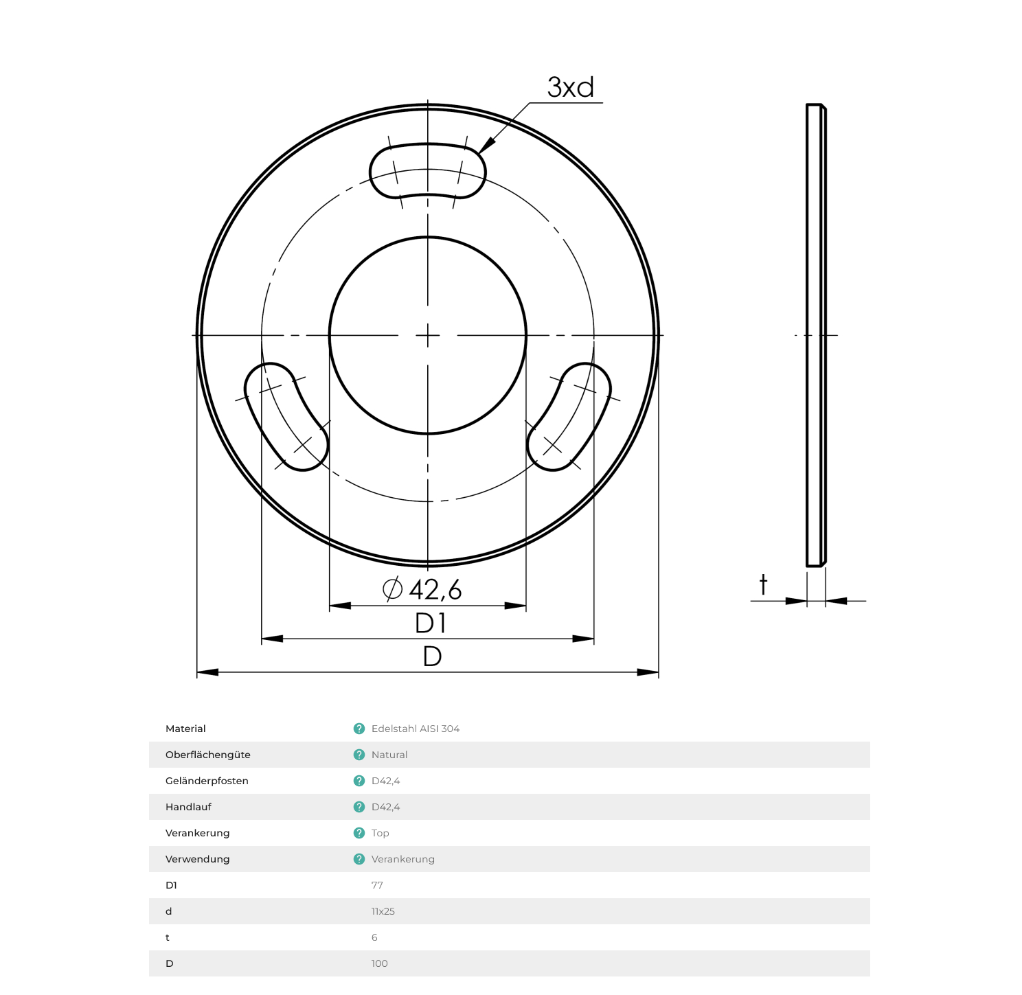 Edelstahl Bodenplatte 100 mm Flansch Pfosten Ø 42,4 mm Platte roh Langloch Ronde